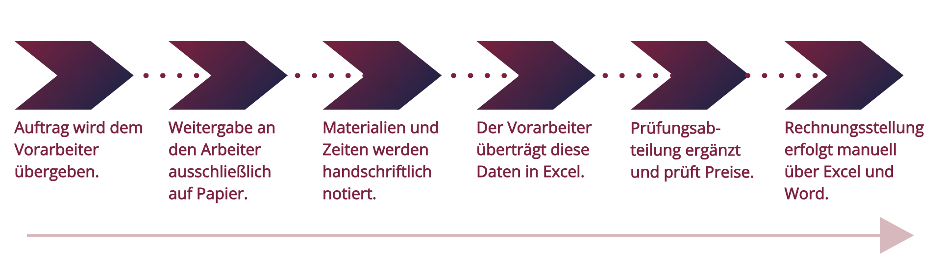 Bislang war die gesamte Abwicklung von der Auftragserfassung bis zur Rechnungsstellung stark papierbasiert. Medienbrüche und manuelle Zwischenschritte führten zu: